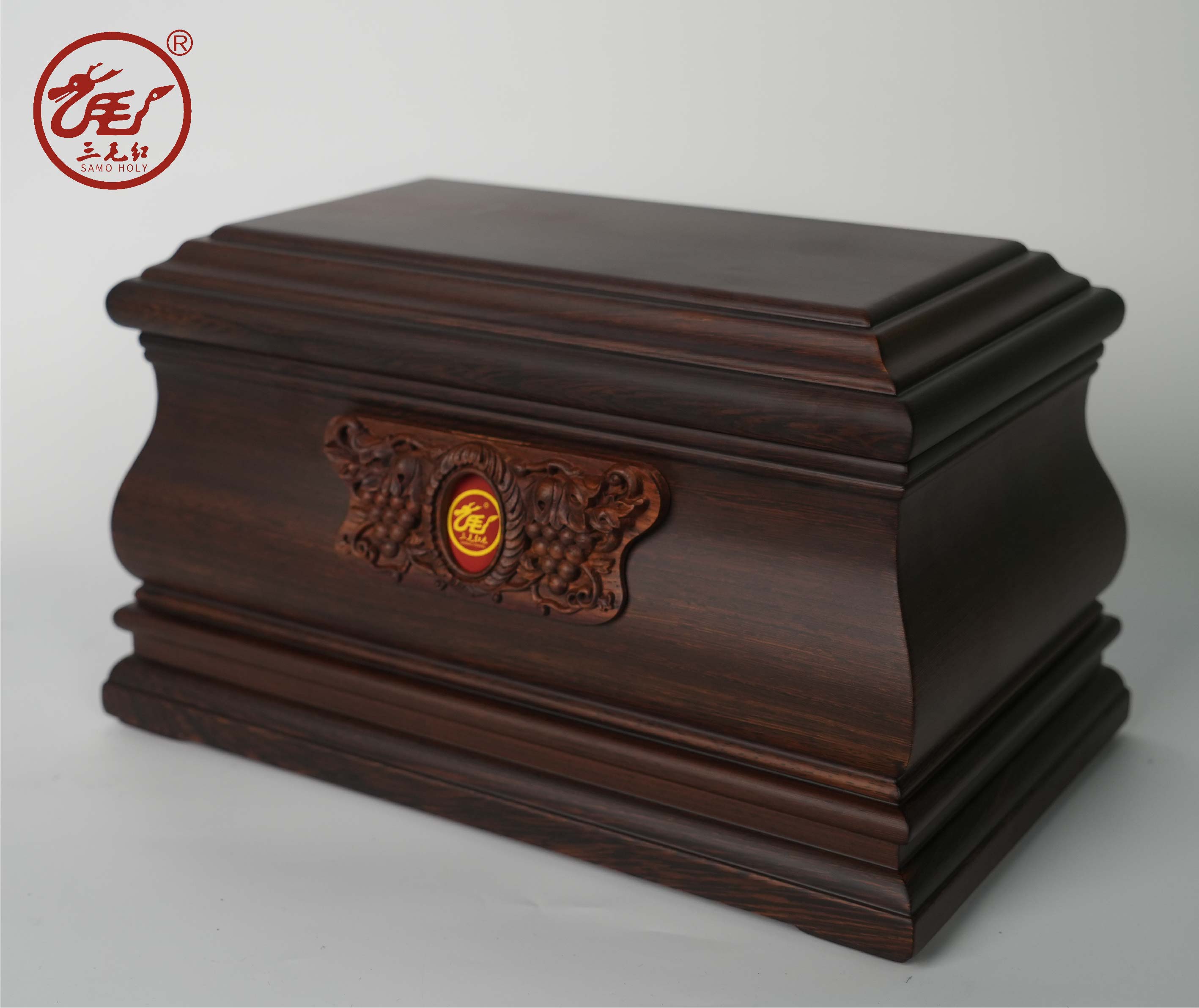寿盒设计造型如棺,意在升官发财;葡萄纹和蝙蝠纹的结合,葡萄象征多子多福,蝙蝠象征福运临门,寄托对后人子孙昌盛、福泽绵长的美好祈愿。